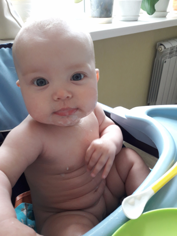 На сегодняшний день едим гречку, кукурузу и кабачок. Начало было трудным, Лида не реагировала на еду никак, зато сейчас хоть и немного, грамм 15-20, но съедает хорошо. Каши безмолочные делаю на своем молочке, кабачок варю сама, свежий, с огорода.
