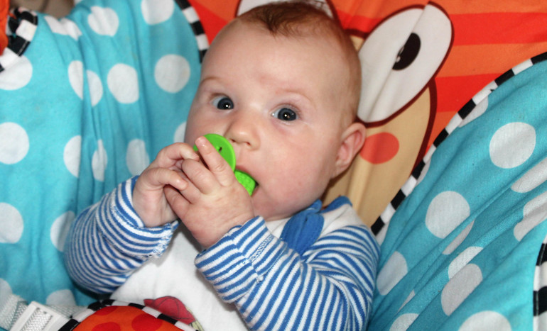 Заметила, что смотрит телевизор. фокусирует свой взгляд и что то рассматривает там. Держит в руках погремушки, соски..пытается держать бутылочку.