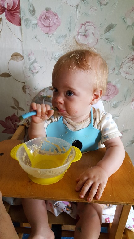 ПитаниеНам 10.5 и мы вырываем ложку. Василиса вроде пытается загребать..а Сашенька совсем уж не готов))) может секреты есть какие?