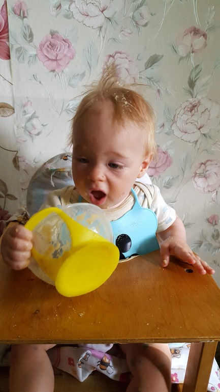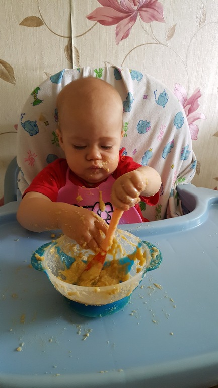 Дочке почти 1 и 2 мес., посдедние недели согласна есть только если ей тоже в руку дать прибор, но координация и точность наведения еще недостаточная :/ думаю к 1,5 освоит, чтоб относительно быстро и более менее чисто, а пока морока.