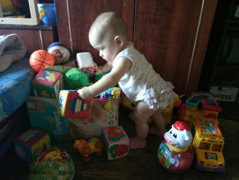 Вот нам и восемь было 25 августа!Растёт моя булочка!Весим мы не много,всего 7850 кг,набрали всего 250 гр за месяц и 4750 от рождения.Но мы очень шустрые,ползаем со скоростью метеора,сама садится,встаёт и ходит у опоры.Наконец мы научились не падать,когда встаёт у опоры,а садится на попу и потом ползти.Очень много говорит слогов ма-ма,па-па,ба-ба,любимое бу-бу и га-га.С режимом у нас беда,по ночам очень плохо спит.Ложимся в 10 часов и боле менее спим до 2-х,а потом начинает вставать в кроватке,капризничать.Я ей дам бутылку со смесью,съедим и вроде уснёт но через 10 минут просыпается и опять капризничает и так до 7 утра,а потом вообще начинает играть.Зубов у нас 2 нижних но верхние лезут.Едим всё так же смесь нан гипоаллергенный.С прикормом беда,нас сыпет на всё.Не как не начнём есть нормально.Вроде кабачок ввели,всё хорошо ели с удовольствием,потом рис и кролика.Больше ничего не вводили,с введения кролика прошла неделя,мы ели хорошо,но встаёт утром и опять все щёки в красной корке.Врач сказала опять всё отменять и ждать и потом всё заново.А мы так хорошо ели и с таким аппетитом.После отмены прикорма мы стали более капризными и требует смесь через 2-2,5 часа.В нашем возрасте детки уже столько всего едят,а мы всё не как.При ней есть вообще не как,она лезет в тарелку и говорит амь.Плакать уже хочется из-за этого дурацкого диатеза.Я всё таки надеюсь,что мы скоро всё таки начнём нормально кушать,ну хоть что нибудь.