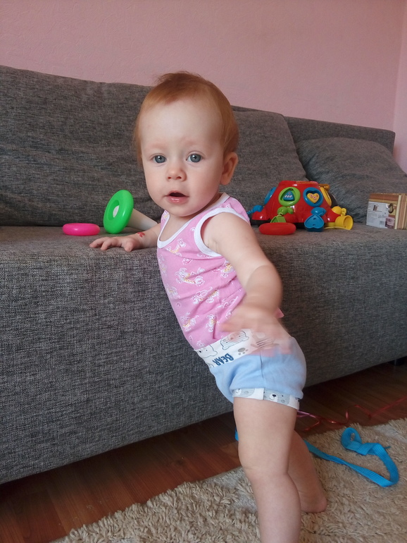 Вообщем девочка активная она везде и всюду, везде за Соней, играет, то они в прятки с ней играют, Ника смеётся) она не с кем не смеется, а только с Соней) я ее рассмешить не могла, она только кряхтела, а тут недавно Соня спряталась за дверью, Ника за ней, Соня выскачила "ку-ку" ей говорит, а та залилась смехом) теперь она с ней смеётся всегда) любит с ней играть, хоть Соня и обижает ее....