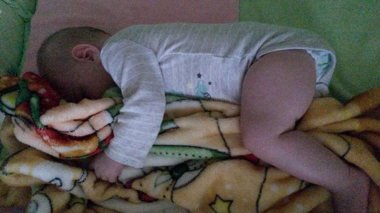 Моя тоже так спит, только носом в матрас и главное, чтобы он был помягче (детские матрасы мягкостью не отличаются, поэтому пришлось класть подушку). В идеале - тот что на нашем диване)))) От пеленок и покрывал ( у нас был муслин и трикотажный плед) я ее отучила, т.к. все ж опасно, всю ночь так стоять не будешь отодвигать от носа.