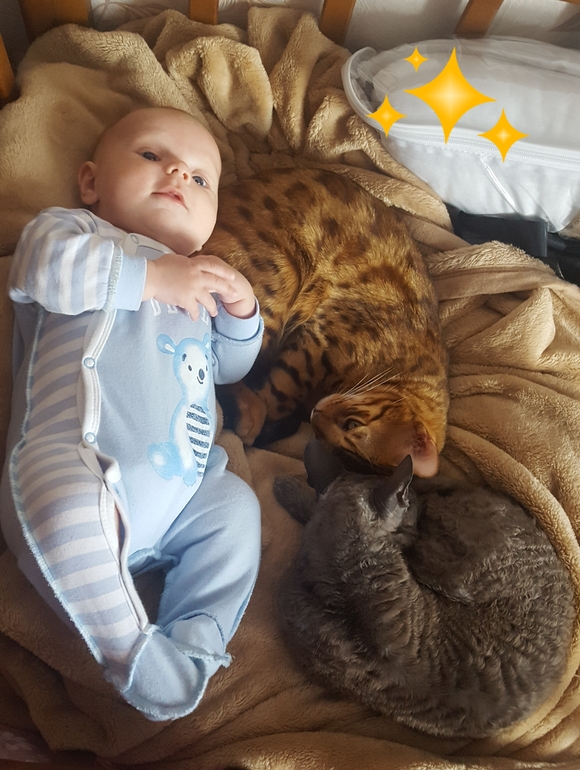 Хорошо котик ребёнка не обижает) но ревнует к папе сильно😒 Как только с утра с ребёнком в кровати играться начинает , кот сразу прибегает и начинает папу вылизывать😂 Ко мне ревности нет, кот меня не считает членом их семьи😅