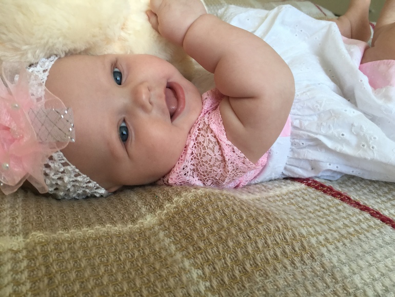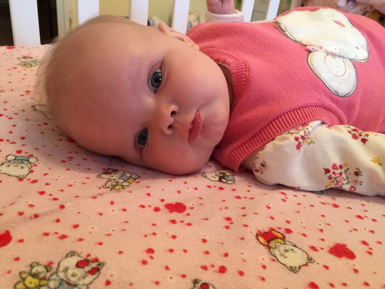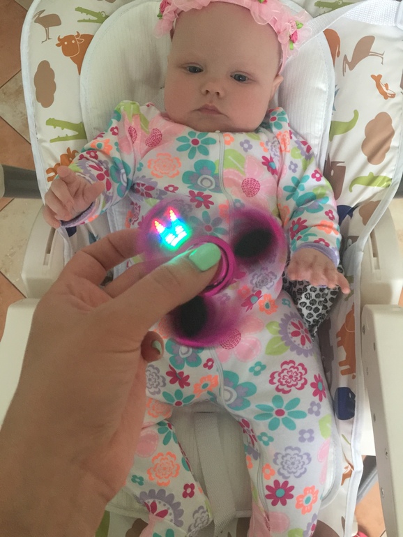 Есть любимые игрушки. Ей теперь лёжа на животе с ними играть интереснее. Крутится во все стороны, поднимает попец и дотягивается за своей целью)