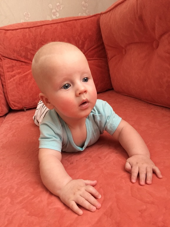 Вообще Сава стал очень активный и подвижный, крутится вокруг свои оси, каким то непонятным пока что мне образом перемещается по полу, по дивану и кровати. Положу его в одно место , на минуту выйду , он уже в другом месте. Сегодня вот таким образом упал с дивана ((( положила его на середину дивана (до края далеко со всех сторон) , раньше , ещё буквально неделю назад оставляла его так спокойно, на пару минут. Тут тоже оставила, на спине, и вышла в туалет. Уже когда мыла руки (прошло минуты 2) , слышу плач , горький громкий плач. Подбегаю он лежит на полу, причём в 20ти сантиметрах от дивана, на спине, и ногами к дивану. Как он так свалился, как он добрался до края, я ломаю в догадках голову. Слава богу, что высота совсем маленькая. И ребенок больше испугался нежели удвоился. Очень быстро успокоился оказавшись у меня на руках. Вот такой вот шилопоп растёт.