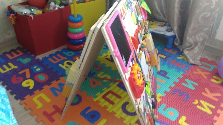 На нашем дверца, шпингалеты, колеса( вот их она обожает). К выключателю равнодушна. Зеркальце можено ещё. Вилку с розетками специально не делали, чтобы не думала, что это игрушка