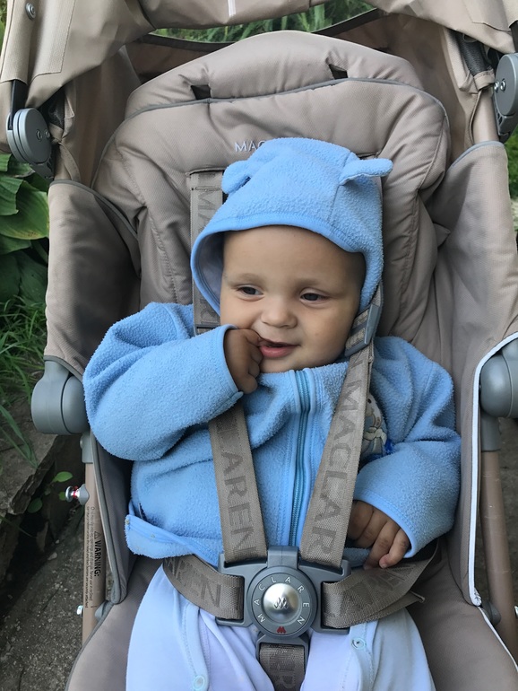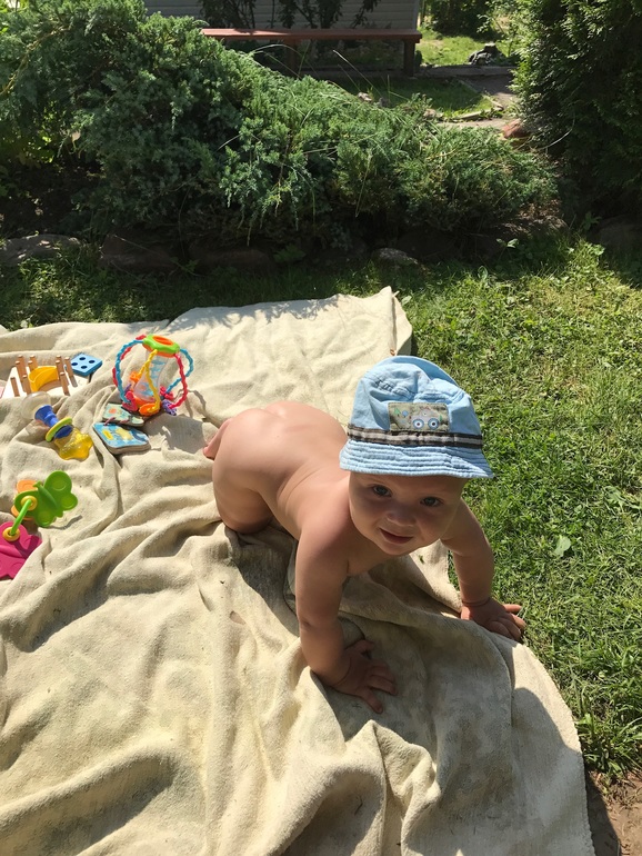 Ходит вдоль всего, а так пока за ручки. Научился слезать с кровати задом и садиться на пол, поднимать стоя предметы с пола. Если держит ложку в руке, то меня кормит, тянет ложку ко мне и смеётся.