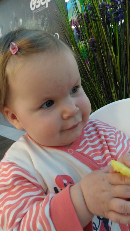 Едим много чего: овощи, фрукты, мясо, творог, рыба, яйцо. Не вводила еще йогурты, соки, молоко. Самое любимое - овощи с мясом (кабачки или цветная капуста с говядиной или индейкой), и творожок, рыба не понравилась. Любит пить воду, как я и все мои дети )) Пыталась попробовать детский чай ей дать, но ей не понравился.