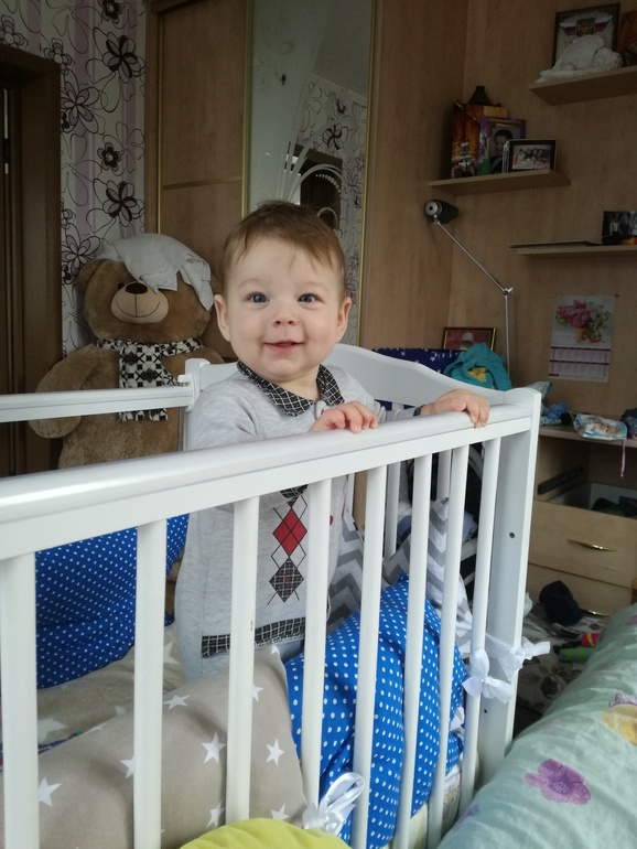 Бортики убирать! Мой так вмкосмонавта играть стал с 5 месяцев, вываливался. Убрала мягкие борты и в 9 месяцев переднюю стенку кровати, тк все равно умудрялся.