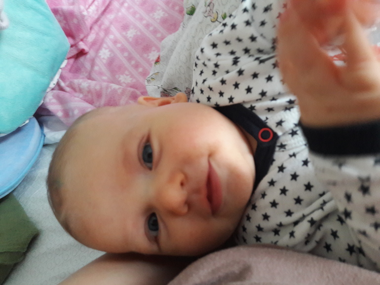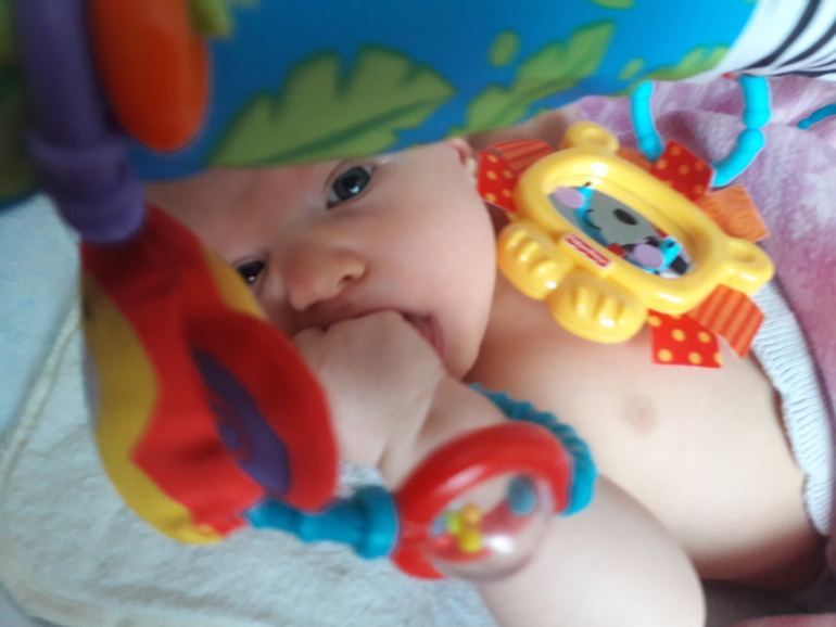 Из нового: тянет ручки в ротик, следит за движением своих рук, в основном правой, за ножками, с легкой помощью (тяну за ручку) при хорошем настроении переворачивается на бочок и по инерции дальше, с животика на спинку. Но бывает капризничает при выкладывании, ничего не хочет делать, только катай его на плече. На коврике максимум минут 15 лежит. Иногда как будто ржёт, такой всклик, похожий на коршуна. Много звуков новых, куку может повторить за мной. Иногда же полностью меня игнорирует, как будто занят чем-то, серьезный такой. Так как на руки чаще беру с подтягивания, если в люльке надоело сидеть, начинает как будто пытаться встать из нее: втягивает шею и приподнимает верхнюю часть корпуса.