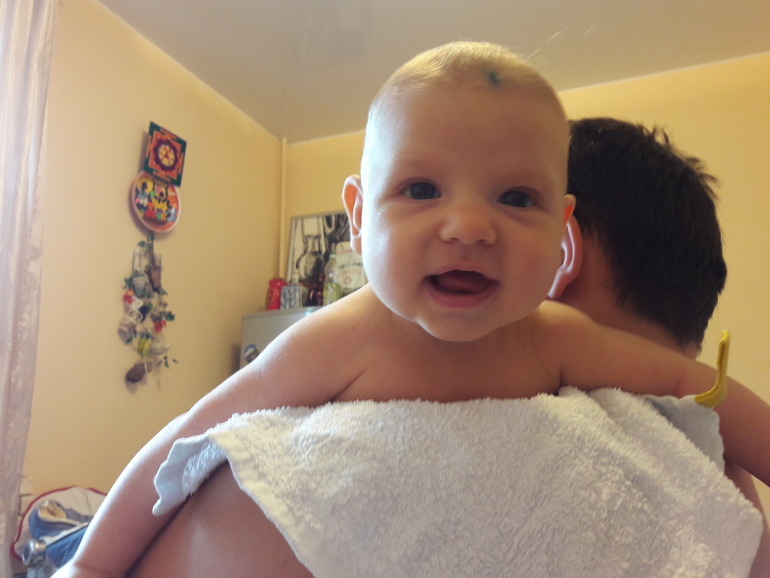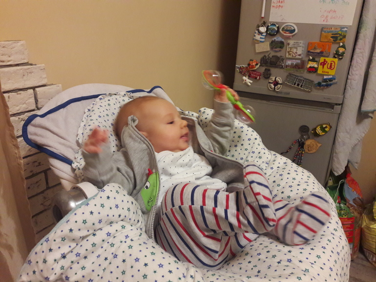 Ездил к бабушке в гости, вел себя очень хорошо на ручках бабушки, всё разглядывал, улыбался. Фото сейчас