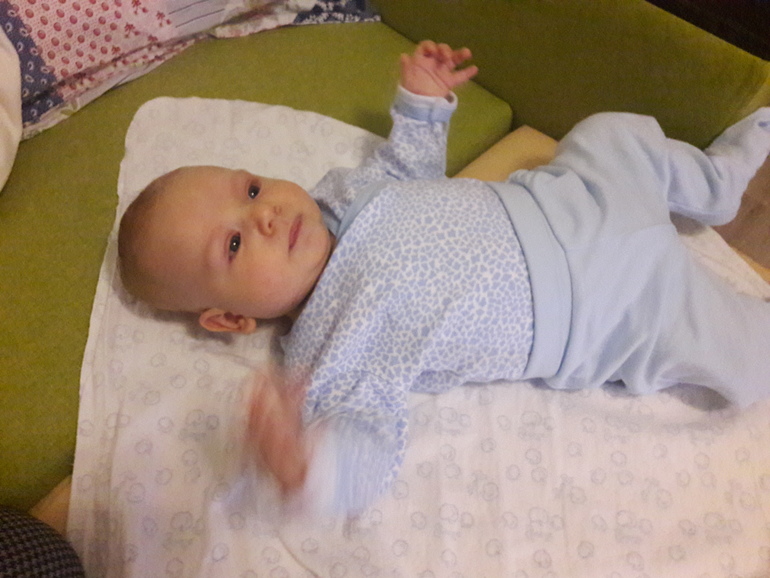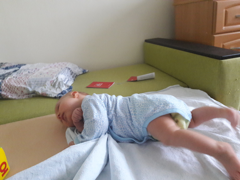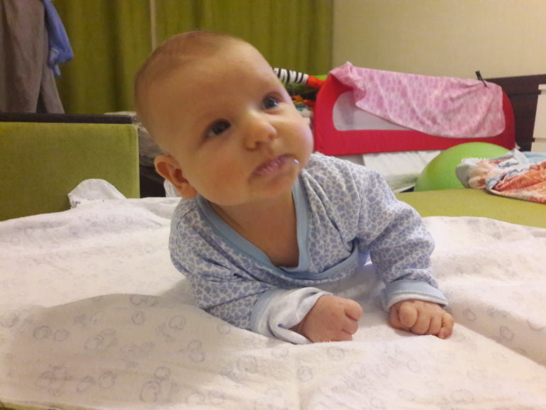 Ну по-хррошему - да, знаю, что рано :) просто целый день отталктвался рукой, ножками дергал, раскачал наверное)) и то, что радостный после переворота остался - поэтому "засчитываю")) первый неосознанный переворот! :)