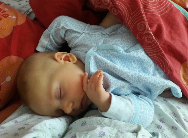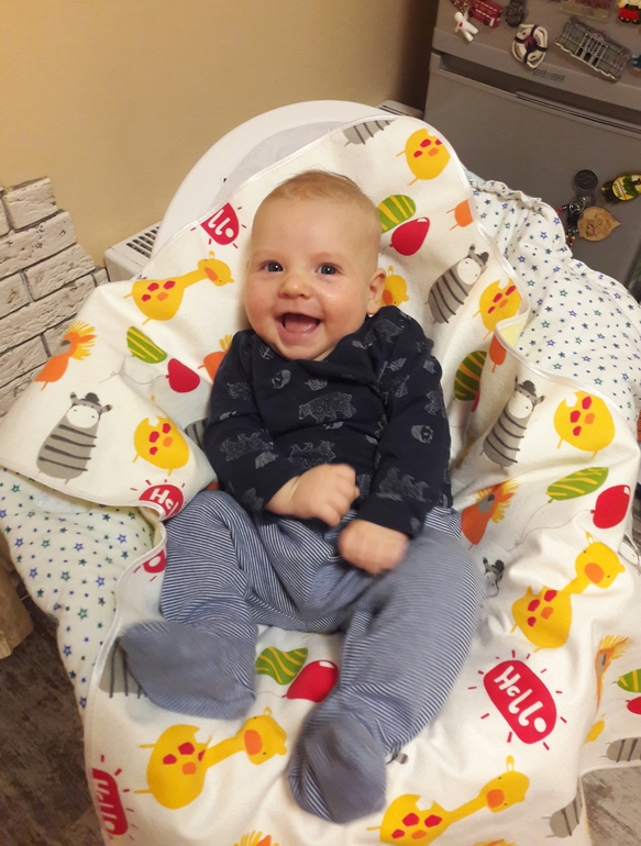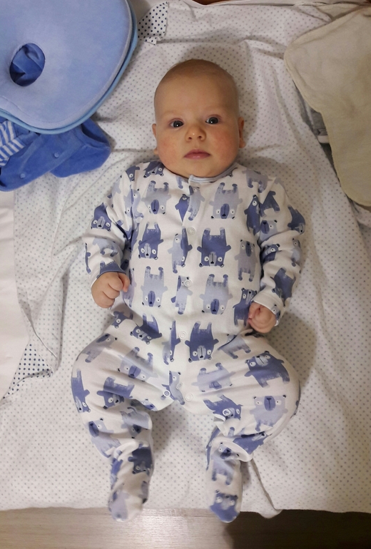 Что замечено: переворачивался на спину и даже на живот три раза, но это происходит два дня, и вот уже давно не переворачивался, даже на бочок не поворачивается теперь, если не помогать (не осознанно было, будем ждать), зато стал ползать на спине вверх, см на 20 меняет положение, упираясь в подушку, тоже самое со звуками - то гулят прям сильно, а то совсем задумчивый, раньше куку говорили, теперь в основном пузырики пускаем, а еще стеснюльки показывает очень часто. Фотки нет, жаль. Говорить начинаешь - он голову втягивает, пузырики пускат и смотрит искоса, ручки друг с дружком сцепляет и вниз оттягивает, очень убедительно выходит это))