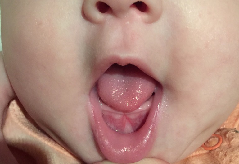 Язычок как раз самое интересное место прикрыл)) зубки могут начинать двигаться в десне заранее. Больно сейчас, а зуб вылезет только через месяц) полосочку на десне видно?