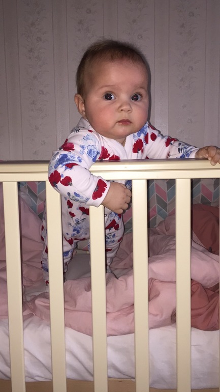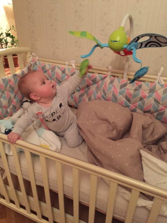 В 6,5 подняли бортик, раньше был низкий, чтобы предупредить выпадание и привычку подглядывать через него. Привычка эта часто мешала заснуть. Мобиль тоже сняла, так как мешает укачиваться, да и особо не интересен уже. О том, что может его снести не думала, а сейчас почитала и видимо верно, что убрала.