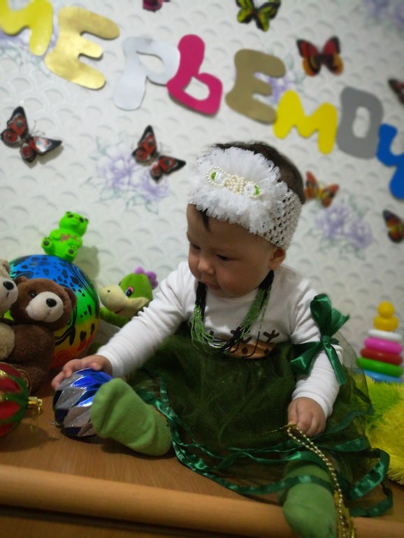 Отчёты по месяцамВсем привет и с наступившим Новым 2018 годом! 26 декабря нашей ерошке стукнуло 8! месяцев!!! И вот наш отчетик : рост 73см, вес 10кг 400гр. Курпненькие мы) что умеет делать моя доча : очень активно ползаем, встаем у опоры уже давно, гоариим слогами:мамамама, дадада, татата и конечно же буууухххх))) девочка моя очень общительная, любит к тогда дома есть гости, играет у них на ручках, но если устала и хочет кушать, то идет только ко мне. И от меня уже ни к кому не пойдёт, сразу слезы... ))Сон наш сон... спим мы в основ 2 раза в день. Все таки перешли на 2сна. Один в районе 12 часов на улице с дедушкой. Потом мы спим где то в 5-6 дома с сисей во рту))у нас активное ГВ но и прикорм мы вводим тоже активно, уже едим гречку, рис, кукурузу на завтрак. Но в основном конесно гречка с фруктами. На обед у нас овощи : броколли, тыква, морковь, цв капуста. Ближе к ужину фрукты:бананы, яблоки. рларирую вот вот вводить мясо, картофель и кисломолочку. у нас 6 зубиков. )))Новый год мы встретили вместе с доченькой. Думала она будет спать но какой там. Мерьем была бодрее всех домашних. Сделали небольшую фотосессию. Она у нас была елочкой. Делюсь с фото.
