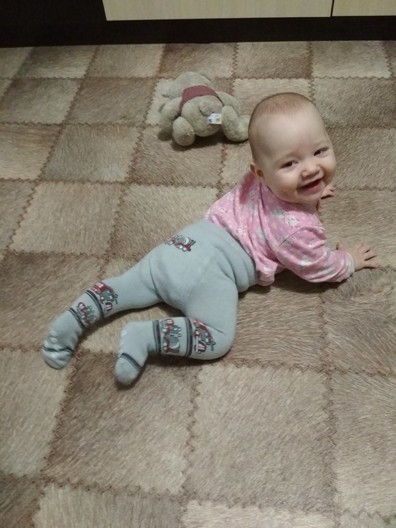 Ползает во всю по всей квартире за нами, сидеть не нравится, на руках особо не сидит сейчас надо быть с нами и ползать по нам, перелезать.