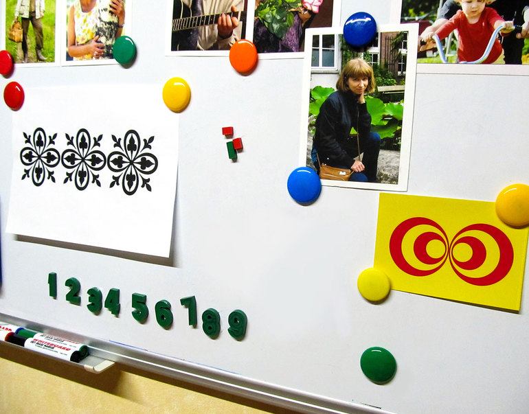 Помимо этого у меня висит магнитная доска, на нее я помещаю разные разности. Например, сейчас, у меня на ней фотографии родни, контрастные картинки и цифры. Последние - для Ксюши, осваиваем с ней обратный счет. Иногда что-нибудь рисую и пишу.