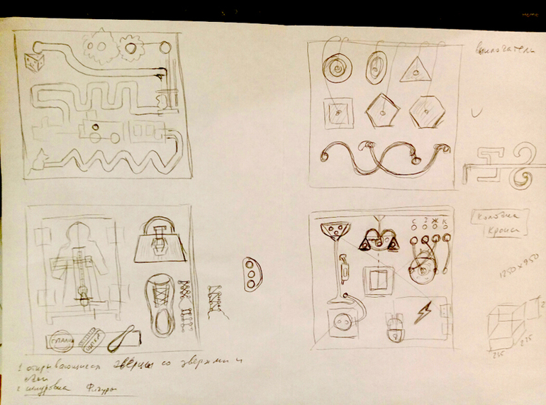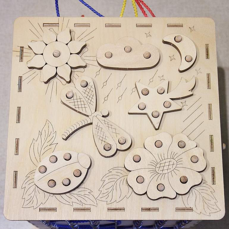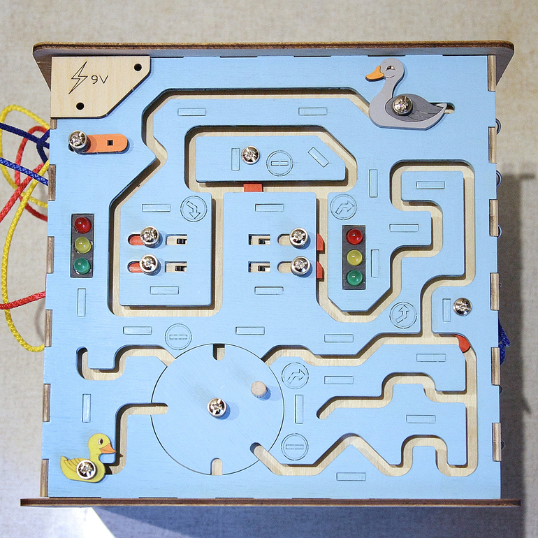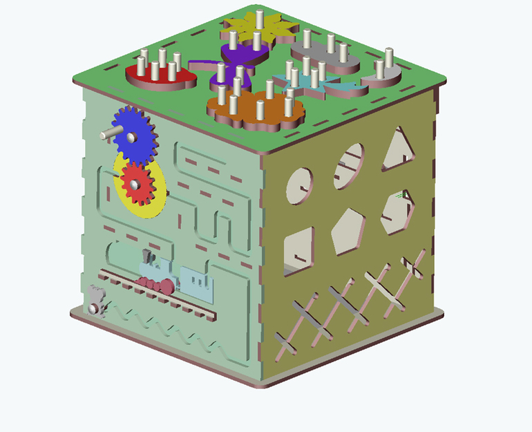 Не девочка, но покажу, что своему ребенку делаю. Бизиборд - куб. Пока только трехмерная модель. В ближайшее время все доделаю и отправлю в резку, а потом буду собирать. Сначала идеи были примитивные, кубики, квадратики. Потом решил две поверхности оставить на логику: на одной веселый мышь должен дойти до сыра используя поездку на паровозике, покататься на карусели с помощью шестеренок; на второй утенок пытается добраться до мамы уточки, используя знаки дорожного движения. Переключатели светофора не дают пройти на красный, предусмотрены несколько ловушек при нарушении ПДД. Верх ориентирован на соотношение количества отверстий - штырьков, другая боковина - форма предметов. Четвертая - обычная шнуровка по скобам.