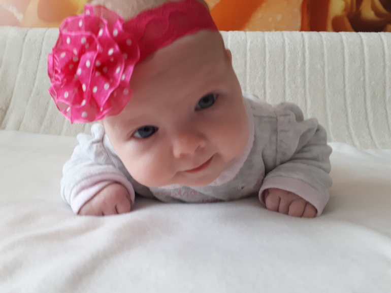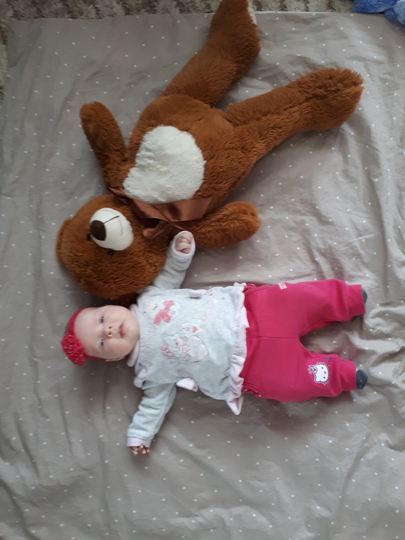 Отчёты по месяцамСабрина в 3 месяца умеет: Любит общатся и гукать, произносит разные звуки (гугу, гинь, один, уу, ее, ой) С 2,5 мес начала хвататься ручками. Сама погремушку не берет, пытается, но если вложить в ручки о держит очень долго и звенит. Мягкие игрушки тянет в рот. Кулочки сосет. Неделю назад начала переворачиваться с бока на живот, перед кормление получается секундно. Если поспит хорошо, может самостоятельно полежать и поиграться. Любит чтобы носили самолетиком. Хихикает когда щекочу. Много улыбвется. Любит садится за ручки и делать гимнастику. Со второго месяца стала засыпать с грудью, качать не нужно было и она не хотела. Только спит мало по 20-40 мин. Днем, если гуляем то спит около 1-1,5, дома только 40 мин. Поэтому стараюсь гулять всегда, иначе день превращается в мучение для нее и меня. Неделю назад начал снова менятся режим, стала плохо засыпать. С грудью не засыпает и капризничает тогда. Приходится укачивать. Иногда вечерний сон никак не уложить, тогда идем гуляем полчасика, купаемся и ложимся на ночной сон. Стараюсь больше 2 часов не бодрствовать. Но на ночь бывает больше проходит. Ночью спит не плохо, но кушает как когда от 2 до 4 раз. Ночью кряхтит, иногда тужится, иногда просто хочется сосать грудь неособо из за голода. Спим вместе. В кроватке своей не спит. Встаем около 8-9, ложимся спать около 22.00 За день имеем 3-4 сна. Кушаем каждые 3 часа. Не любим: Мыть лицо и голову. Сидеть в качельках, шезлонге. Спать одной Самое неприятное переболели бронхитом, был сильный насморк и была темп 3 дня 38.3, с антибиотиком начался сильный понос. Вес за ту неделю точно потеряли. Теперь вес около 5800-5900 , рост 62. Взвешиваться не пойдем из за эпидемии гриппа и сильных морозов. Носим одежду 62-68 размера, подгузники 2 номер становится мал, но я имею еще 2 мега пачки, может както 1 пачку используем.