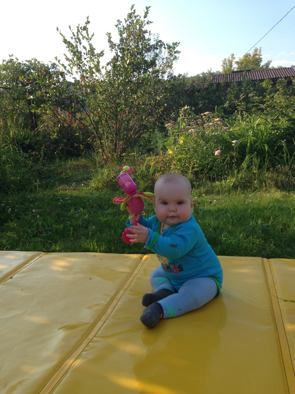 в 4 ребенкиных месяца (апрель) купили дом в деревне, летом ездили туда с четверга по воскресенье. на улице сидел в коляске,пустом надувном бассеине с игрушками, либо стелила плед и спускала на землю.