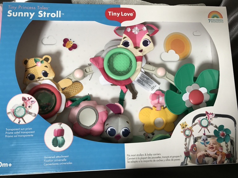А ещё ей оч нравится дубасить по подвешенным игрушкам на стульчике-баунсере. И я решила купить вот такую дугу развивающую тоже Tiny Love. Она и на коляску, и на прогулочную, и на кресло дома.