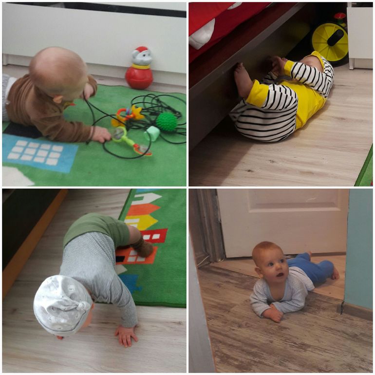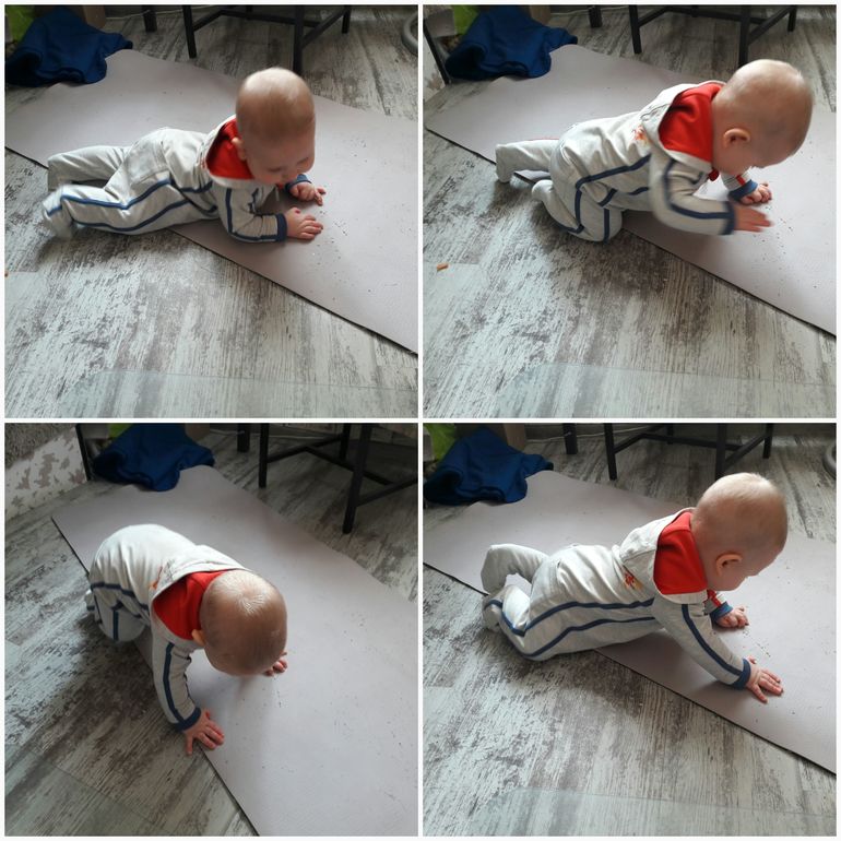 Из умелок еще- с начала месяца еще начал стоять в тачке, какое-то время раскачивался, сейчас уже просто стоит и пытается ползти, но спотыкается о руки и какие-то финты еще выделывает с четверенок, приседает как-будто на бедро. Вот думаю, это он к тому, чтобы сесть, наверное, готовится. Планка, собака мордой вниз и на трех лапах - освоено, цепляется рукой за бортик кровать и привставал на коленках, в ванной в круги - на ножки.