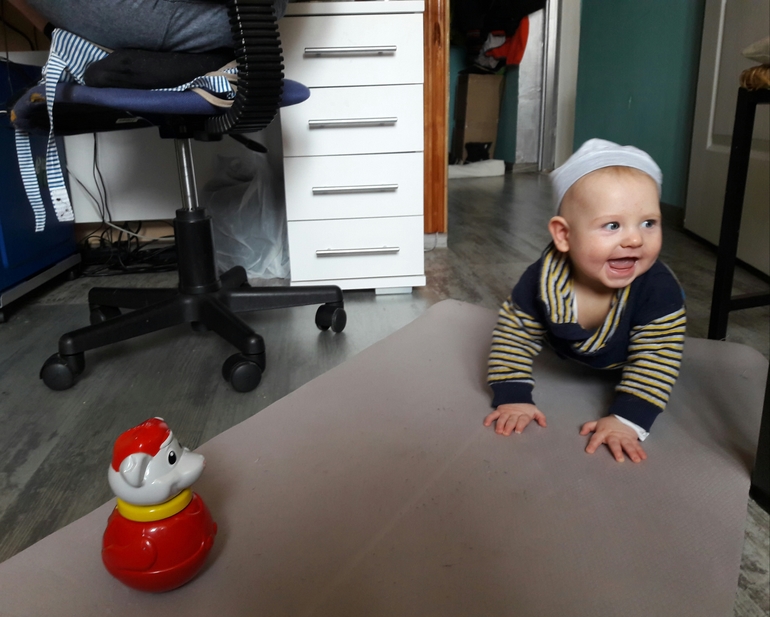 А Ванюшка ползает во всю, сам перемещается на кухню, в комнату - куда ему вздумается, глаз-да-глаз за ним. Но так-то вролне и ничего пока, не скажу, что прям сложно уследить, нормально. Любимое - провода. О да. Игрушки на втором плане, если не на третьем, кегли может еще идут.