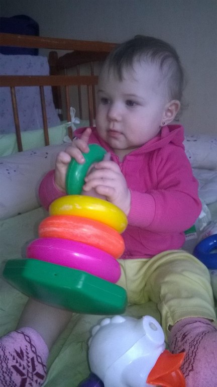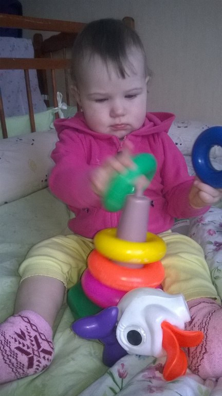 ХвастаемсяНачался у нас скачок в развитии. Теперь мы научились собирать пирамидку) Умничка моя. 10 мес.18 дней.
