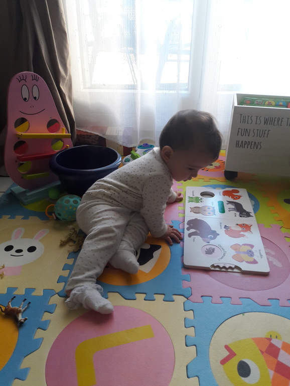 Книжка фоанцузского издательства Nathan, серия Kididoc. Очень приятные картинки с животными (домашние, лес, саванна, Африка, джунгли, море), и интерактивная, надо колёсико крутить, чтобы малышей подобрать. Доча уже давно на неё залипает, колёсико крутит.