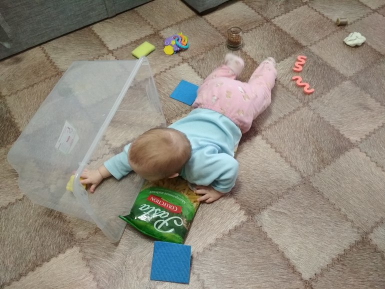 А так же собрала для неё контейнер для развитии моторики. Это наш первый вариант, самое начало. Владюша всё брала в рот, изучала ) )