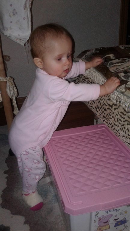 - уверенно стоит на ножках у опоры,хорошо и быстро ползает. Любит устремиться вдаль на полной скорости за мячиком. Обязательно нужно сидеть рядом,когда играет - проверяет периодически,где мама. Если беру ее игрушку,бросает свою и лезет ко мне,чтобы отобрать;