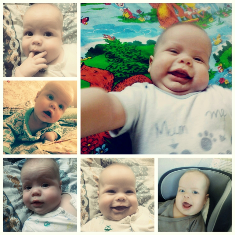 Еще один месяц прошёл, сходили мы к педиатру...... мы вообще собирались пойти ровно в 4 месяца,но нам позвонили и сказали прийти 19 на прививку от полиомиелита ну и как раз взвесится и помериться. Оказалось мой кабанчик набрал за месяц 1300 и весит 7800.но раньше мы стабильно набирали 1100 а в этот раз нам врач сказала что мол многовато и он может из за веса отставать в развитии немного. Рост 65 см. Прививку нам не сделали потому что у нас температура оказалась 37,2 и горло красное((( выписали лекарства так что лечимся. Ещё и голову вроде держим но иногда неуверенно что тоже не есть хорошо.