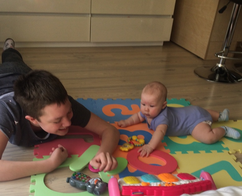 Обожает плавать в ванной с подарком от старших - набором резиновых зверят. Любит гимнастику и массаж, но иногда бывает не в настроении.
