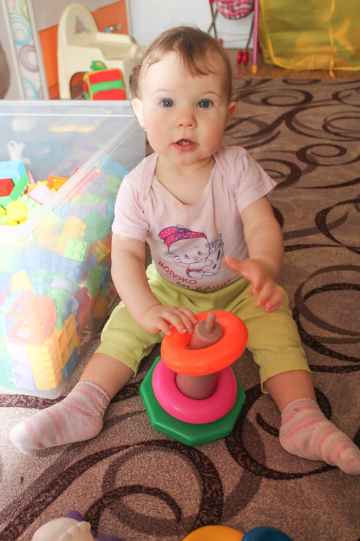 Пирамидку собираем-разбираем.Вообще очень любит играть в игрушки : конструктор или погремушки, ей без разницы. Если в настроении то долго может сидеть и играть,перебирать. В этом плане дочка молодец.