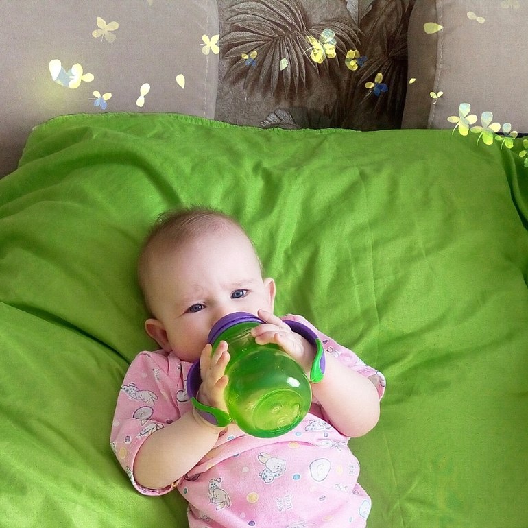 Отчёты по месяцам6 месяцев и моя дочка взрослеет) Таисия вертится со спины на живот и обратно, ползает на пузе, встает на коленки, лицом, правда, в пол), любит лежать на боку, играет погремушками,играет в ку ку, кусаки мусолит, зубов нет, ввела каши, овощи, фрукты, соки, компоты. Любит овощи и каши, от остального морщится. Смесь ест только ночью, 2 раза. Узнает бабушек и деда, маму, папу. Появились любимые игрушки. Тянется ко всему что у меня в руках ( кружка, яблоко, банан...), облизывает))). Встать не пытается, да и ортопед пока запретил. Бормочет, как умеет эга эба... Стала жутк им водососом))))