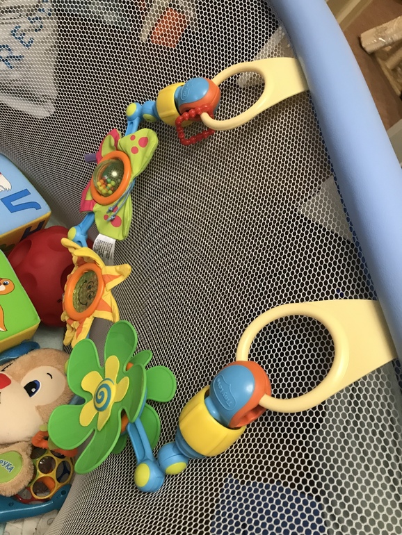 Манеж с ручками . Мой сын недоставал сначала до них я туда дуги и погремушки ( без резинки) прикрепила он за них хватался и подтягивался . Сейчас за кольца от манежа хватается .