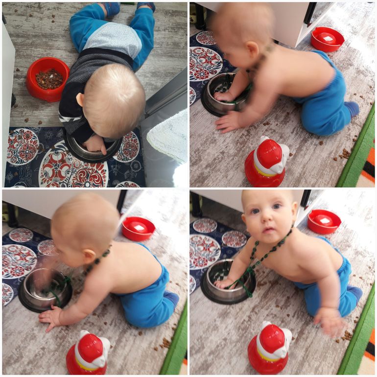 Ооо, моя ходу ползком прибавляет, когда соображает, что я миски забыла убрать)))один раз забыла, прихожу, а она кусочки мокрого корма раскидала и видно ручкой зачерпнула и жует. Я ее подмышку и бегом умывать, а она возмущается и десна сжала....кусочек смотрю жует, еле вытащила его)))У нас все в рот сразу же, поэтому миски всегда убираю....иногда хорошо их мою и пустые даю ей поиграть, чтобы они не были для нее как запретный плод