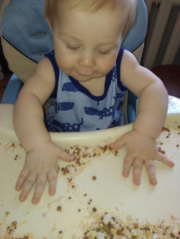 Помимо занятий с карточками начались игры с крупами. Они вызывают дикий восторг. 5-7 минут Жорка перебирает, пересыпает, разбрасывает крупы, далее начинаются настойчивые попытки попробовать игровой реквизит на вкус и занятие сворачивается).