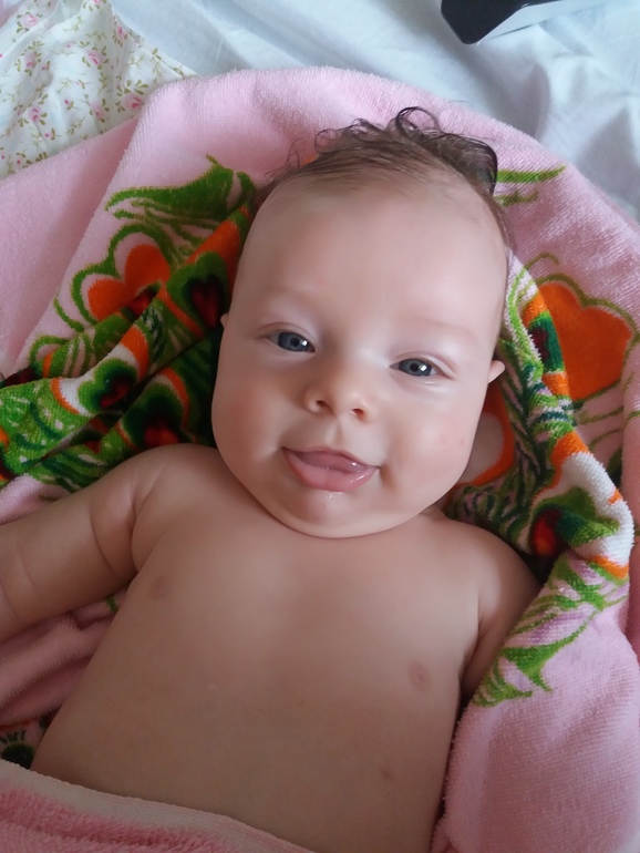 С папулей разговаривает во всю, любит папину бороду, рассматривает, глаз не может оторвать))) Сосет кулачок, аж причмокивает и слюнки рекой))