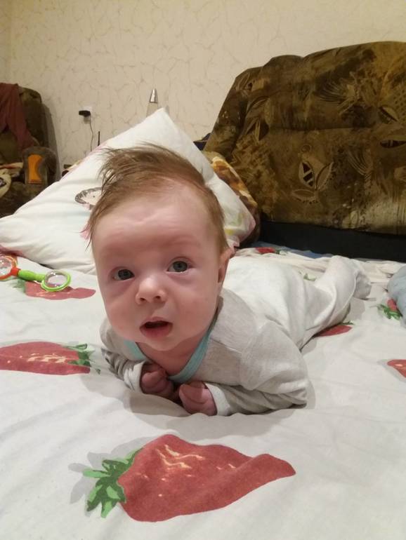 На бок пока не переворачивается, но пробует) Головку держит не долго, но уверенно)