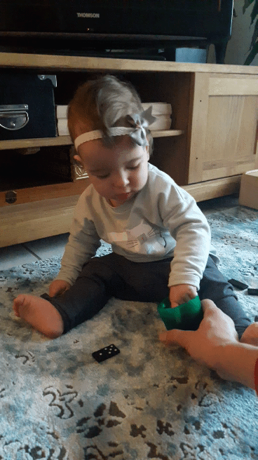 Ваша девочка хорошо работает двумя пальчиками. Молодец! А мой медвежонок только пока хватать умеет всей пятерней.