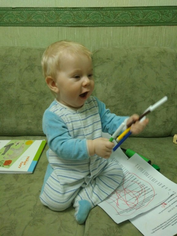 Отчёты по месяцам8 апреля Жорке исполнилось 11 месяцев. Уже совсем взрослый сыночек мой! Каждый день Георгий не перестает меня удивлять) Ни секунды не сидит на месте! Реактивный парень! Приехали на пару недель в гости к бабушке и дедушке, надеялась немного отдохнуть, но в действительности я устаю еще больше! Если дома мы давно обезопасили комнаты и я могу хоть на какое-то время оставить его одного, то здесь малыша вообще нельзя оставить без внимания ни на секунду! Это что-то невероятное: он везде и всюду! С легкостью залезает на диван, кресло, детский стульчик - встает на нем и тянется выше к полкам (аквариуму..). Ходить еще не начал, только за руку или самостоятельно от одной опоры шаг-два до другой опоры. Ждем)