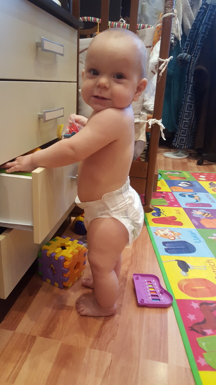 Физическое развитие. Все так же ползает, встает, ходит вдоль опоры. Но! Теперь иногда отпускает руки на некоторое время (когда забывается, наверное) А 2 дня назад, когда он вот так отпустил руки, я его подманила к себе игрушкой, и он сделал 3 робких шага ко мне 😇 И так 2 раза. Но больше не получалось. Не знаю, может случайно. Когда теперь пойдет, интересно?