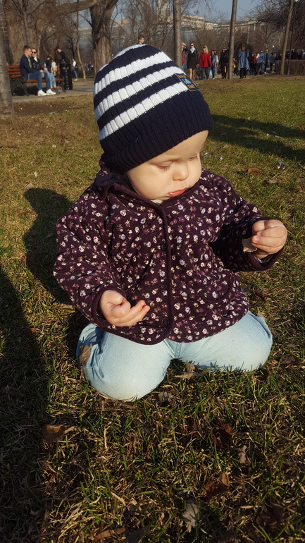 Были в воскресенье в парке Горького. Полазил по газонам (хотя мне было жалко штаны, но я смирилась). И хотел съесть всю траву и листочки сухие. Замучились из рук вынимать))) Пытался обманом затащить в рот, не вышло)