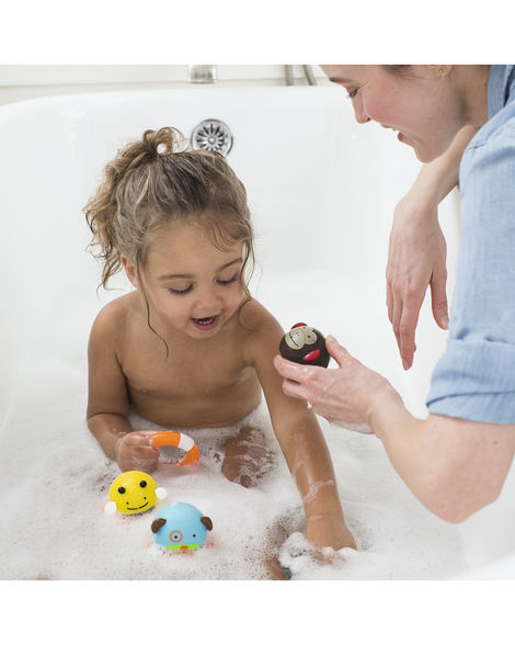 С 4 месяцев точно уже был интерес, каждое купание это охота за всеми рыбками-уточками, но самый фаворит - плавающий термометр 😁