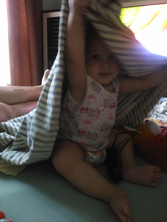 Любит играть в ку ку, прячется под покрывало.Принесли ходунки, сын от них просто в истерике, даже подходить отказывается.