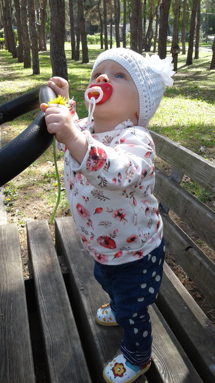 Не любит играть в ладушки и вообще игры с пальчиками прокатывают только когда уставшая. Обожает прыгать на фитболе,подползает к нему и зовет,чтобы с ней попрыгали. Злится и плачет,если нет или когда у нее что-то не получается - например,снять кольцо с пирамидки. Вообще,так интересно,как у нее в голове строятся причинно-следственные связи)