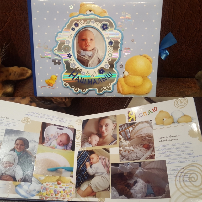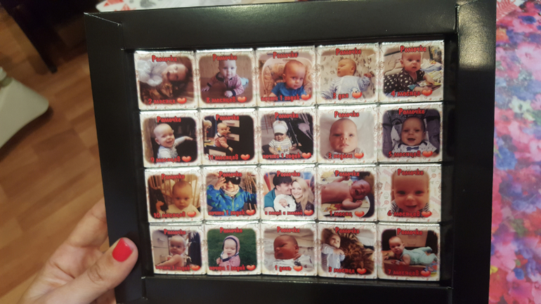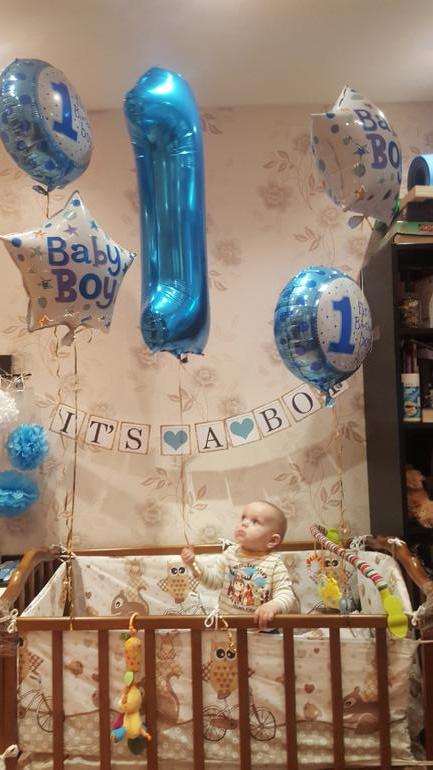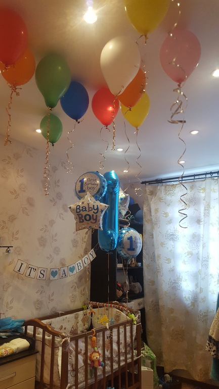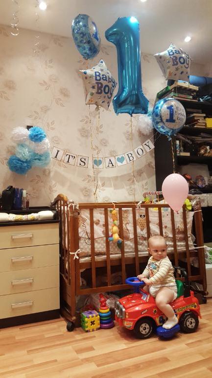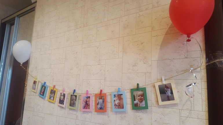 Надули много шариков, украсили комнату. Получилось очень красиво! Еще я повесила ленту с маленькими фотками в рамочках, заказала шоколадки с фотками и сделала альбом. В альбоме - там разные этапы развития, эмоции, новый год, выписка и много разных фоток с интересными подписями) Там даже есть конвертики для Узи и для первого локона (вчера как раз отстригла и положила!). Короче, я немного заморочилась)